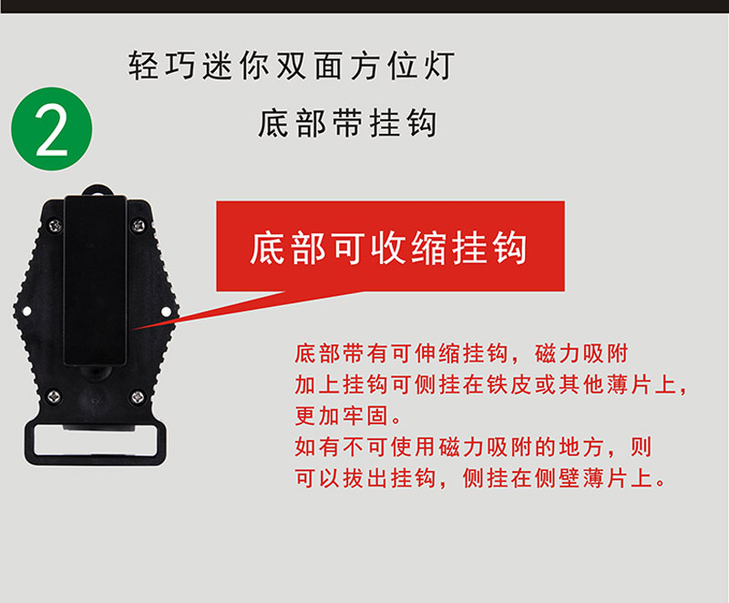 ◆轻便耐用:可手持移动使用,也可利用磁力吸附在钢制件表面或扣挂在物体上使用,可根据需求调节伸缩,操作简单,携带方便;
