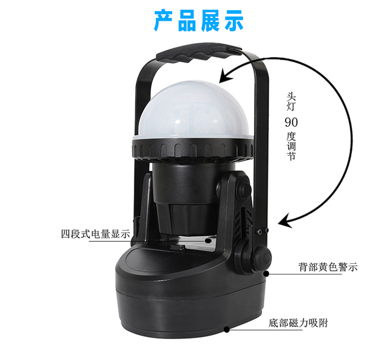 ◆方便耐用:独特的灯头结构设计,照明角度90°~180°可随意调节,全方位照明,重量轻,可手提、座放、吊挂、磁力吸附等,使用方便。