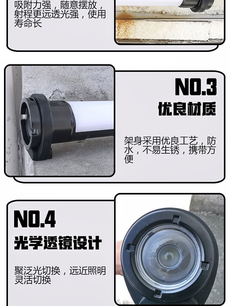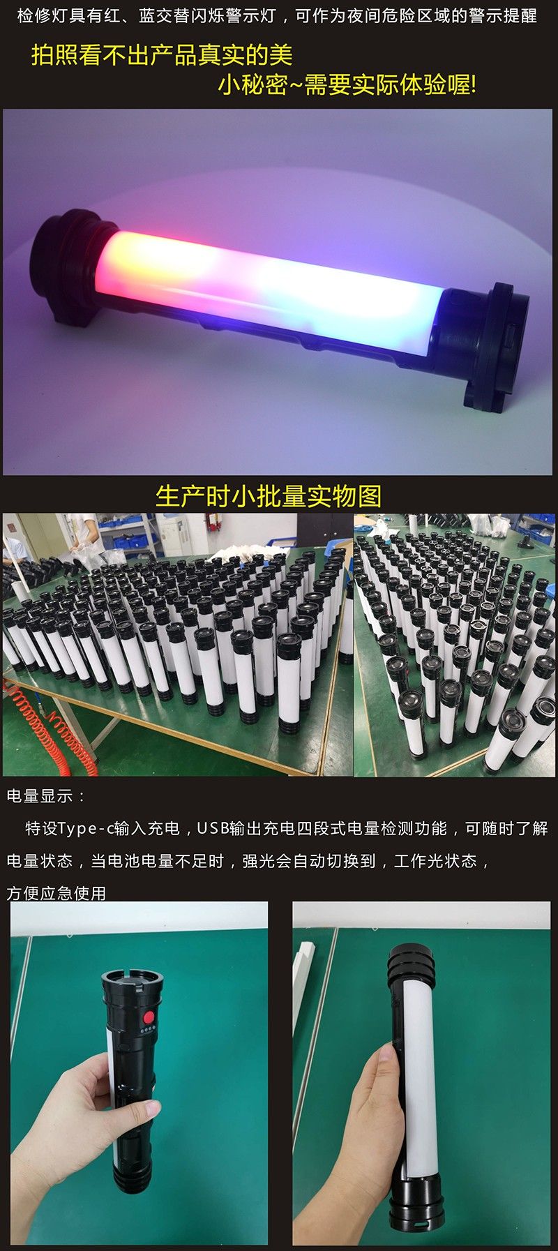 ◆电量显示:特设Type-c输入充电,四段式电量显示功能,可随时了解电量状态,当电池电量不足时,强光会自动切换到工作光状态,方便应急使用;