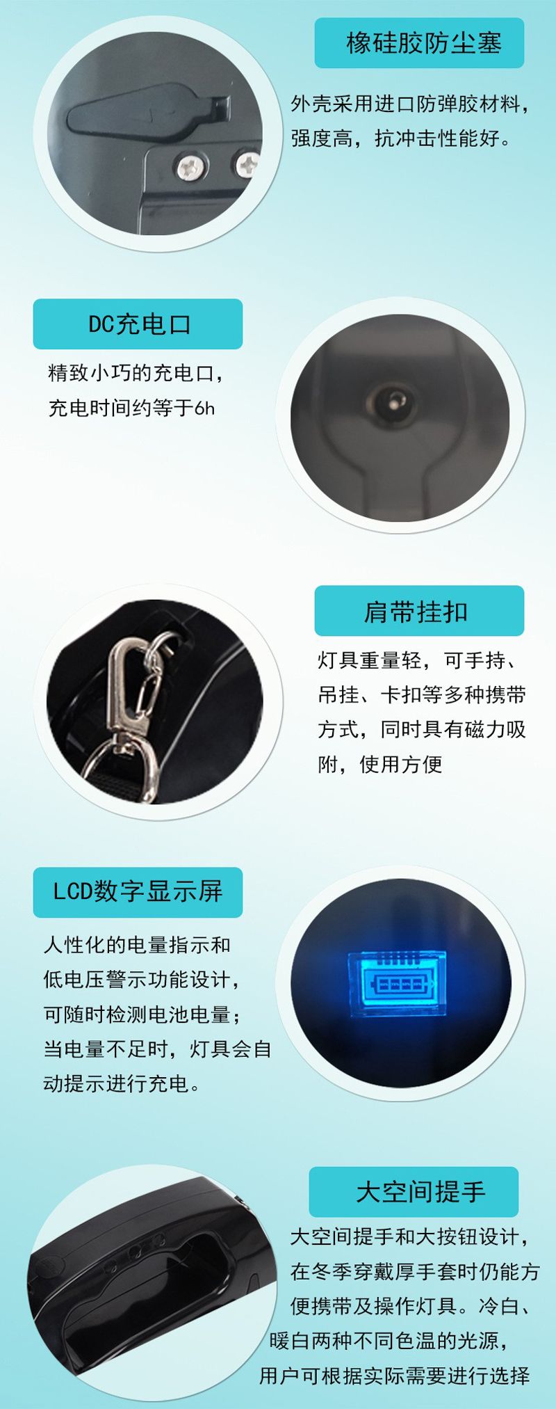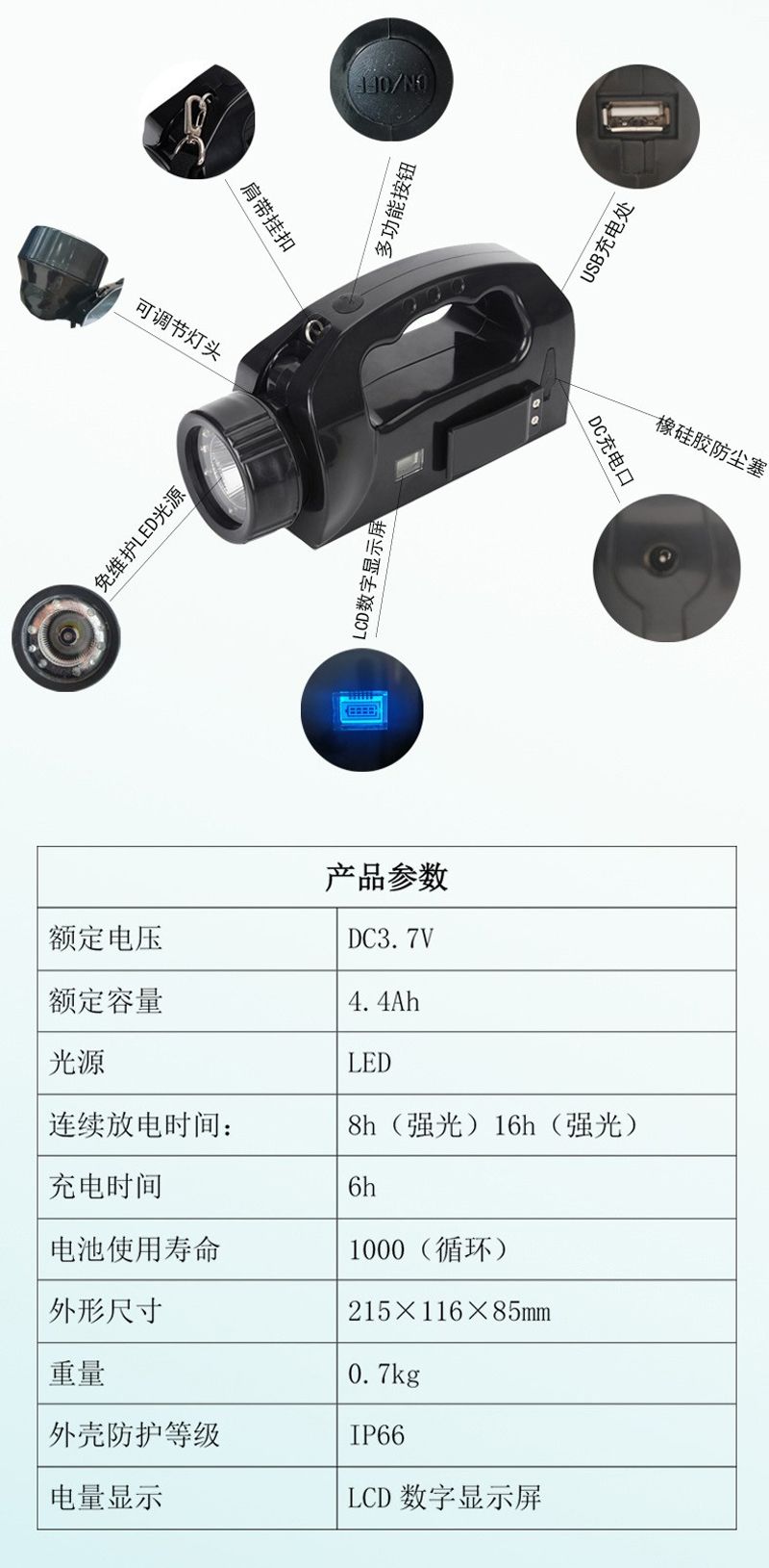 ◆适用性强:大空间提手和大按钮设计,在冬季穿戴厚手套时仍能方便携带及操作灯具外壳防护等级达到IP66,确保灯具在各种恶劣的条件下可靠使用。外壳采用进口防弹胶材料,强度高,抗冲击性能好。