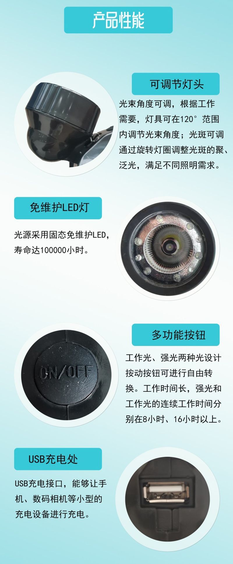 ◆智能控制:工作光、强光两种光设计,按动按钮可进行自由转换。工作时间长,强光和工作光的连续工作时间分别在10小时、20小时以上。