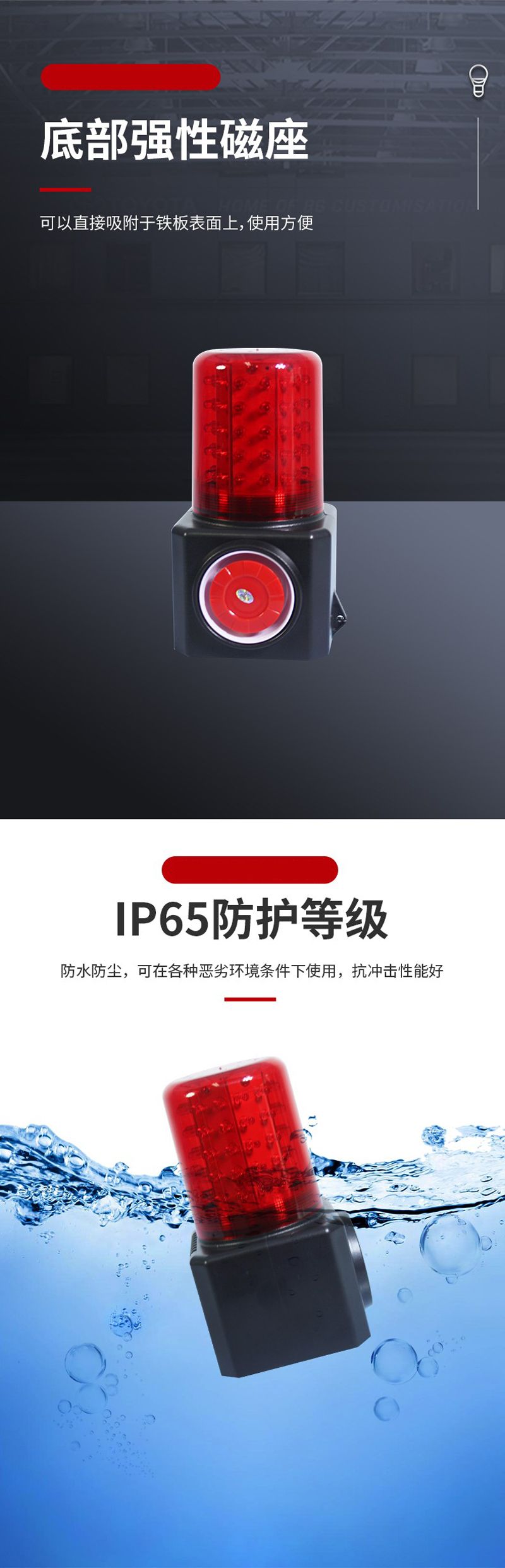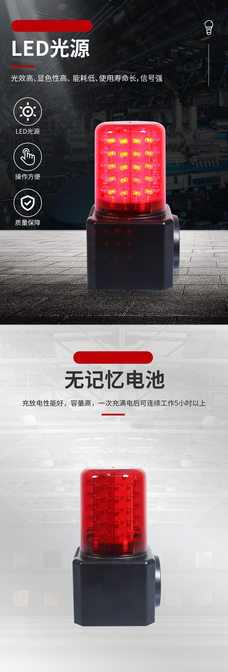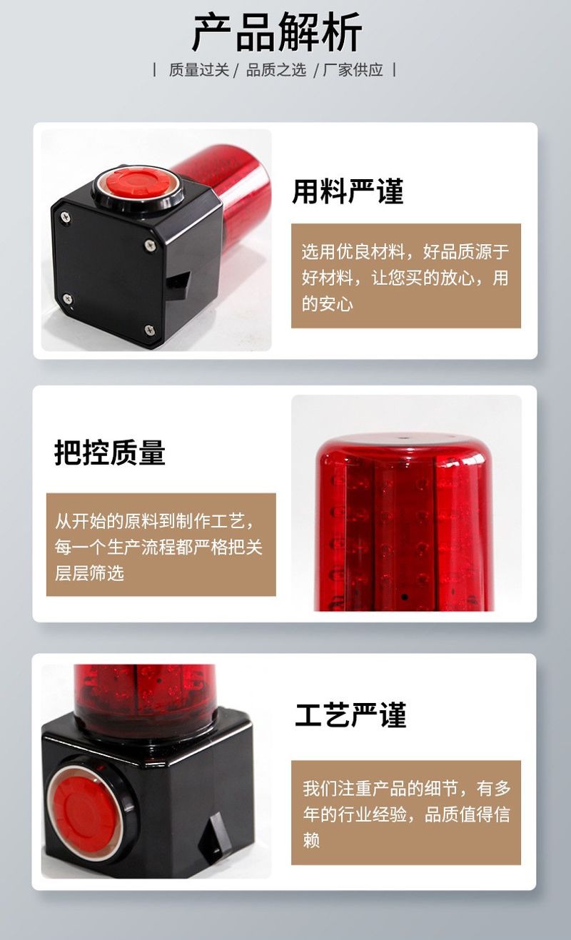 ◆警示性能:采用高亮度LED光源,有红、黄两种选择,亮度高、信号强、能耗低,穿透性强,浓烟浓雾穿透能力可达300~500米,信号光采用高透光率散光罩,使光更均匀,用户可在倒可角度观察到信号指示,报警声采用芯片控制,穿透能力强;