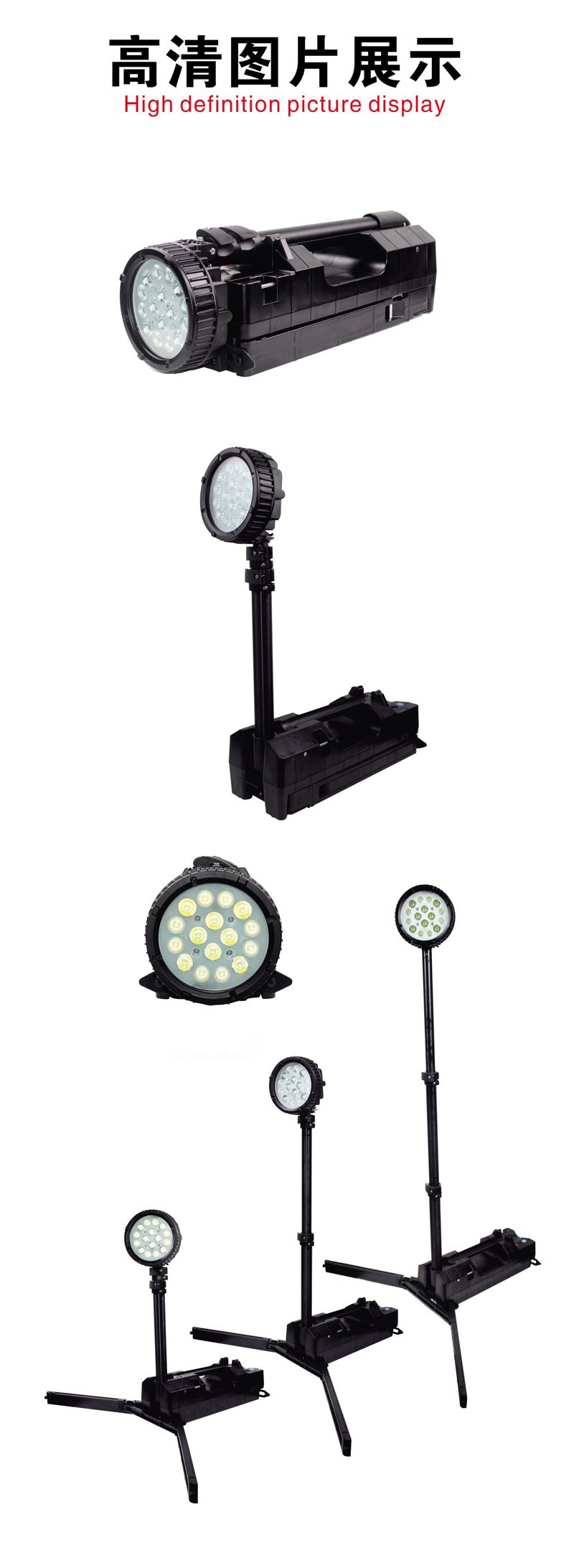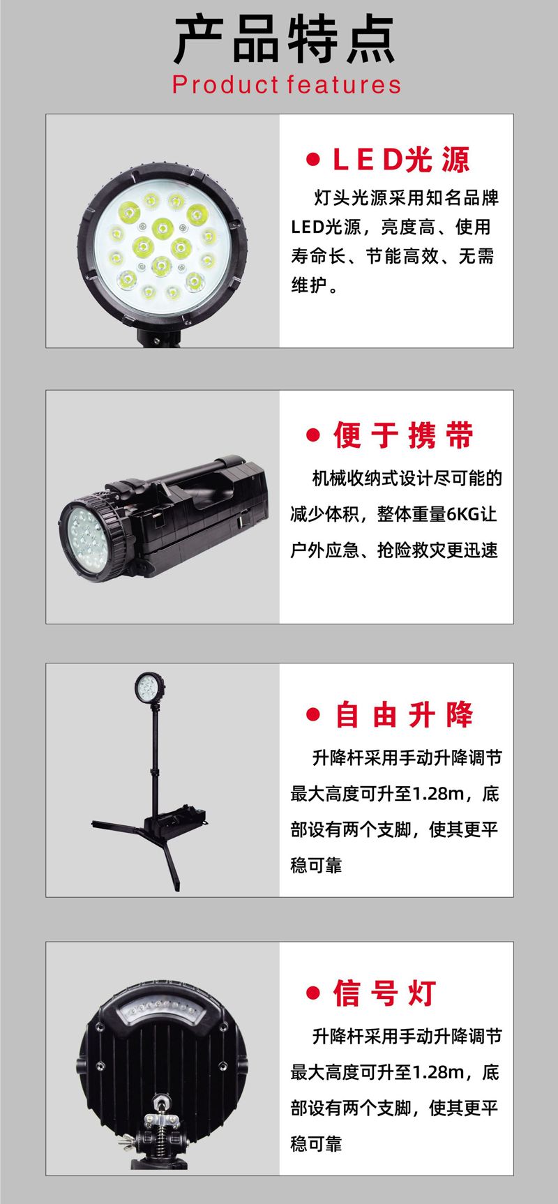 ◆多功能,升降杆可升高到1.2米作固定照明使用,亦可折叠作探照灯使用。