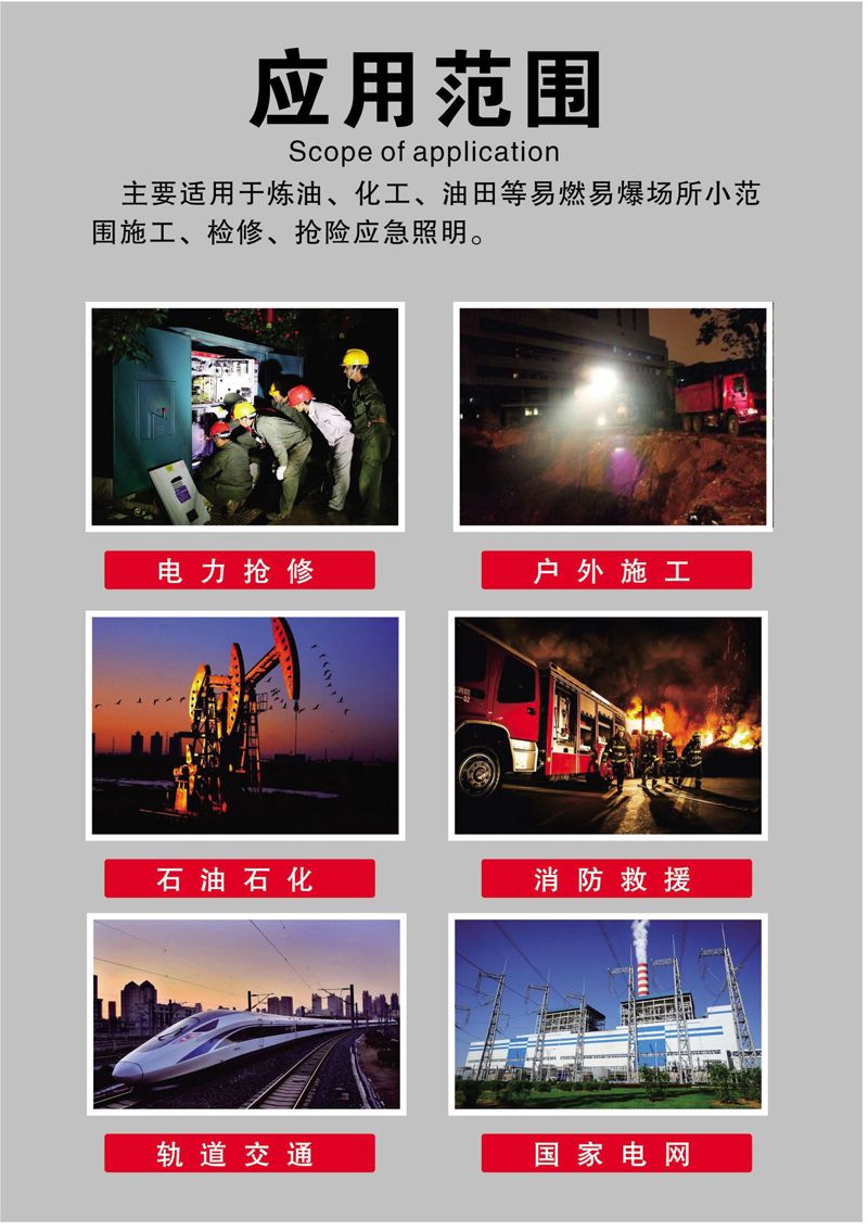 ◆主要适用于炼油、化工、油田等易燃易爆场所小范围施工、检修、抢险应急照明。